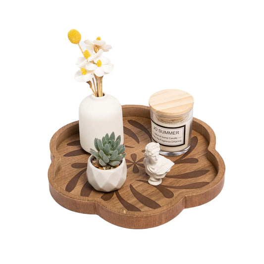 GenMous Scalloped Edge Decorative Tray For Coffee Table Decor Engraved Wooden Round Serving Tray For Kitchen Vintage Centerpiece Candle Holder Tray Farmhouse Ottoman Tray for Living Room Home Decor